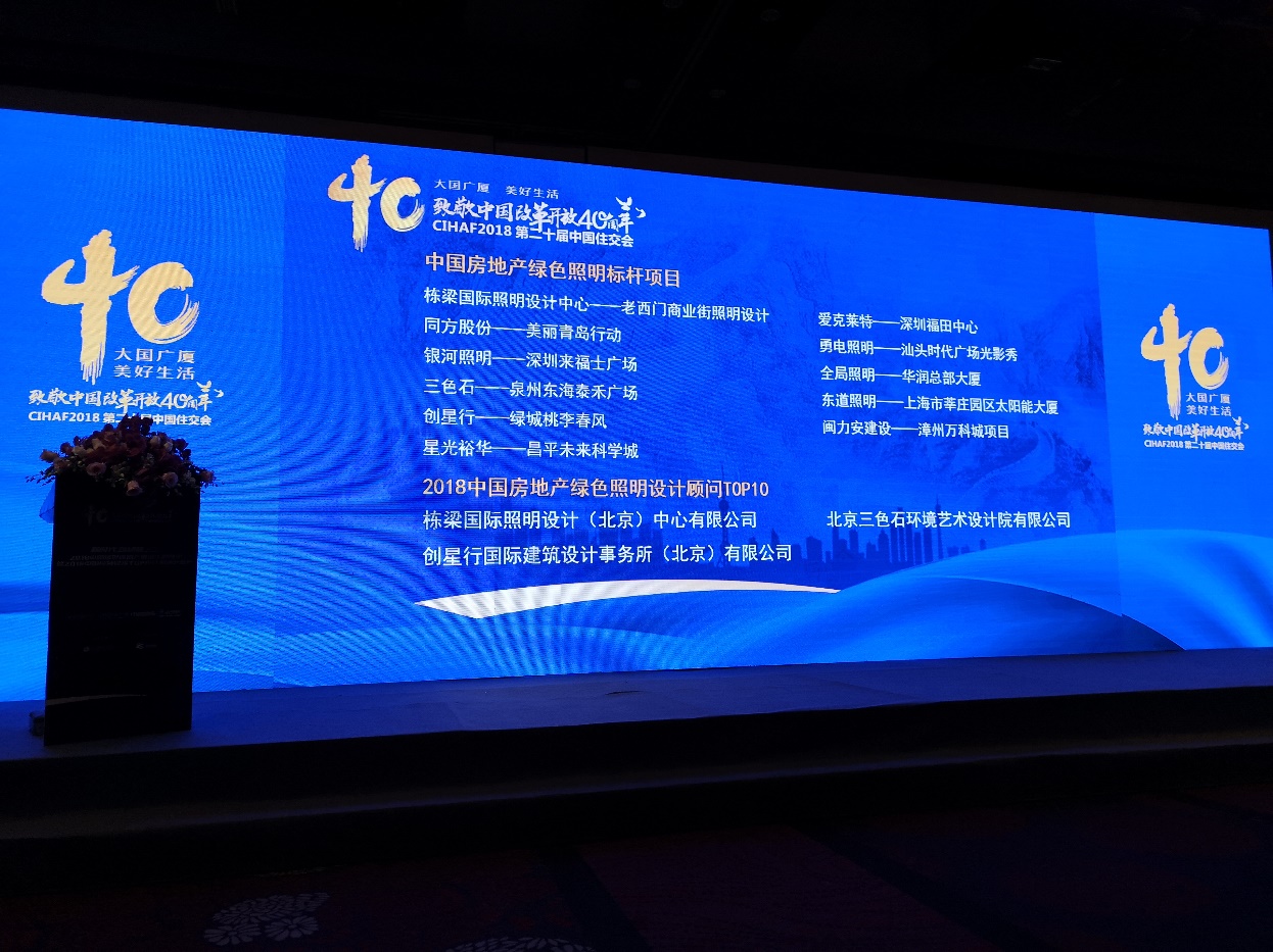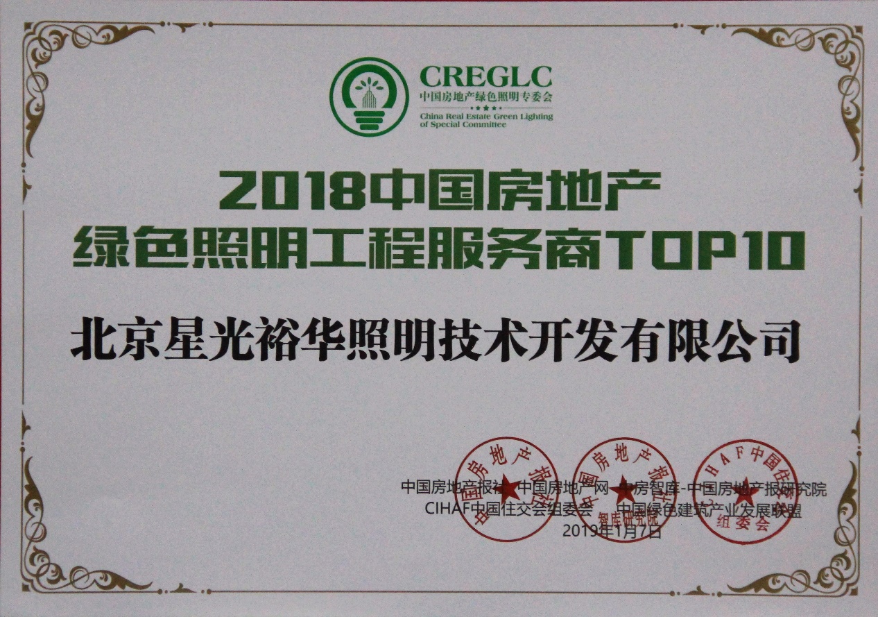 北京星光裕華照明技術開發有限公司作為中國房地產綠色照明專委會發起單位之一,在會上喜獲2018中國房地產綠色照明工程服務商TOP10,且由我司選送參評的北京昌平未來科學城項目又榮獲2018中國房地產綠色照明標桿項目獎。該獎項代表對我們過去工作的肯定,2019我們不忘初心,將“光文化、光藝術、光科技”的理念通過我們繼續傳播