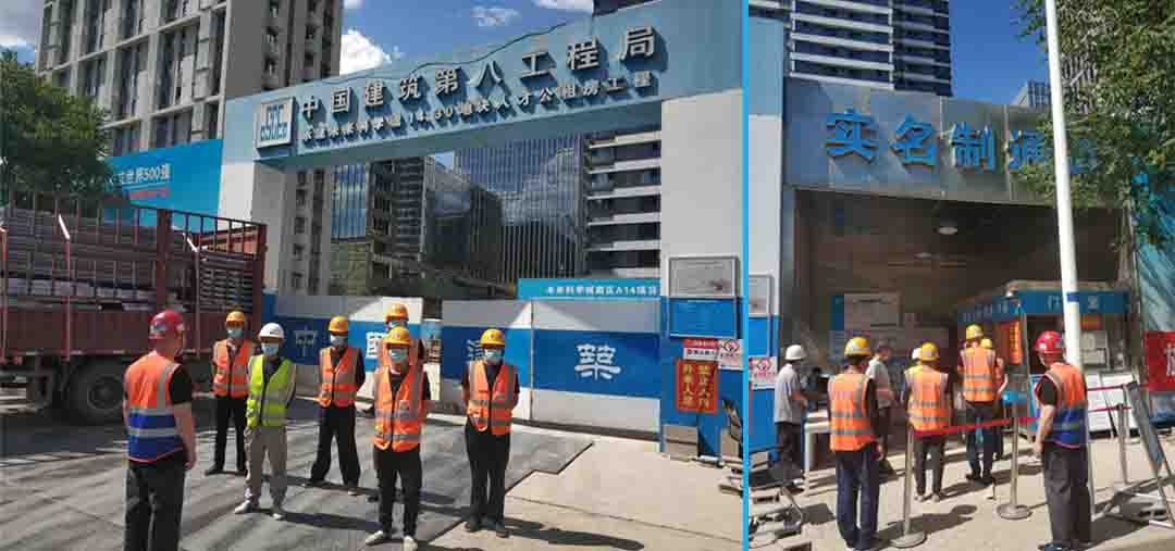 我司在北京未來科學城14/30項目施工現場,工作人員正戴著口罩,對進入工地的工人嚴格做好人員出入檢查并逐個檢查體溫。疫情期間施工為了控制工人與外界人員接觸,工人采用專車接送方式,全面保障每一位工人的安全。