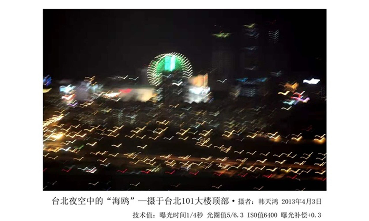 每一次游歷,韓天鴻都精選出有文化藝術的特色之作,目前已有一千多張自己命名的作品。他幾次游歷歐洲和北美,為拍攝出完美作品,在阿拉斯加雪中拍攝極光,把手指凍傷、手指紋損壞;在士庫曼斯坦漆黑的夜里,一個人上山拍《地獄之門》把左手臂摔得肌肉從骨頭上斷裂;在肯尼亞忘情的探出車窗拍攝獵豹,而獵豹突然跑到他眼前,有驚無險……他把一切美好的用鏡頭記錄下來,讓更多的人欣賞。