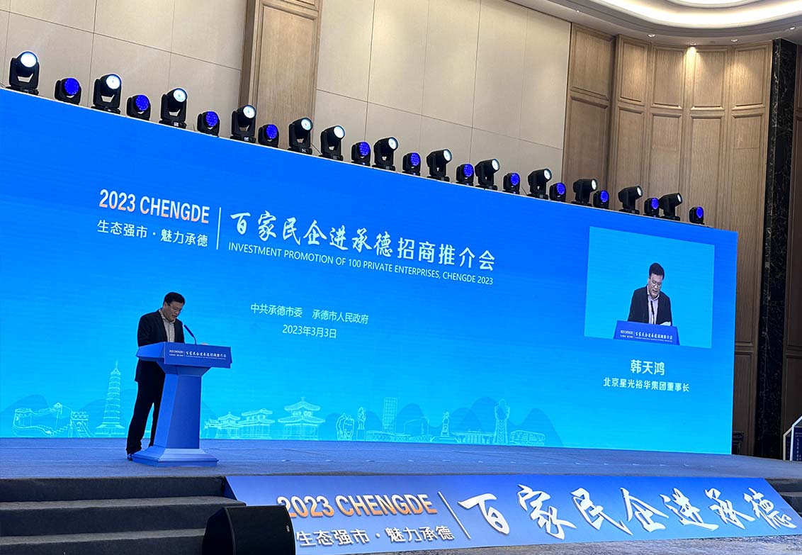 3月3日百家民企進承德,我公司董事長韓天鴻做了主題報告:帶的項目引進投資6個億,規劃、設計、建設、運營承德市區(雙橋區)智慧城市之智慧路燈項目,每年可為當地政府增加財政收入3-4億元!市委書記柴寶良帶領市委市政府領導班子參加!
