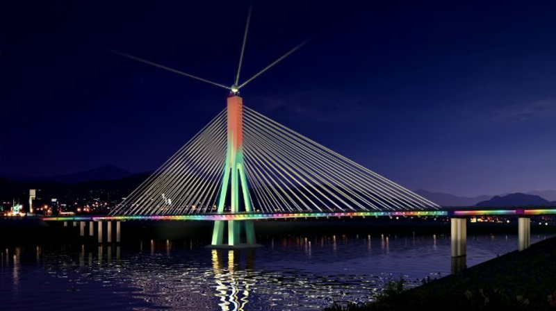 工程峻工捷報:由我公司負責的西雙版納大橋夜景照明工程,已于4月12日即傣族一年一度的潑水節之前完工。 西雙版納大橋位于納州府景洪市,跨越瀾滄江,是云南省目前跨徑最大橋面最寬的斜拉橋。西雙版納大橋全長約600.24米,總高107.5米,橋下凈空按IV-2限制性航道等級要求。凈寬80米,凈高8米,最高通航水位546.8米,西雙版納大橋主橋為2×156米的A型獨塔雙索面斜拉橋,飄浮體系,拉索采用扇形平面布置,全橋共布2×18對斜拉索,橋面總寬是變化的,但機動車道,非機動車道和人行道的寬度不變,橋塔處寬30.76米,主橋頭端28米,引橋寬26.6米,橋面為:15米機動車道+2×3米非機動車道+2×2米人行道。 |