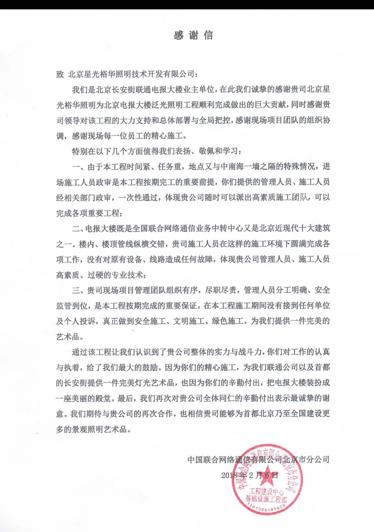 2018.2.6日,北京長安街中國聯通電報大樓景觀照明工程順利通過竣工驗收,并收到一封感謝信,也非常感謝甲方對星光裕華照明公司在施工質量及服務方面給予的高度評價。景觀照明工程